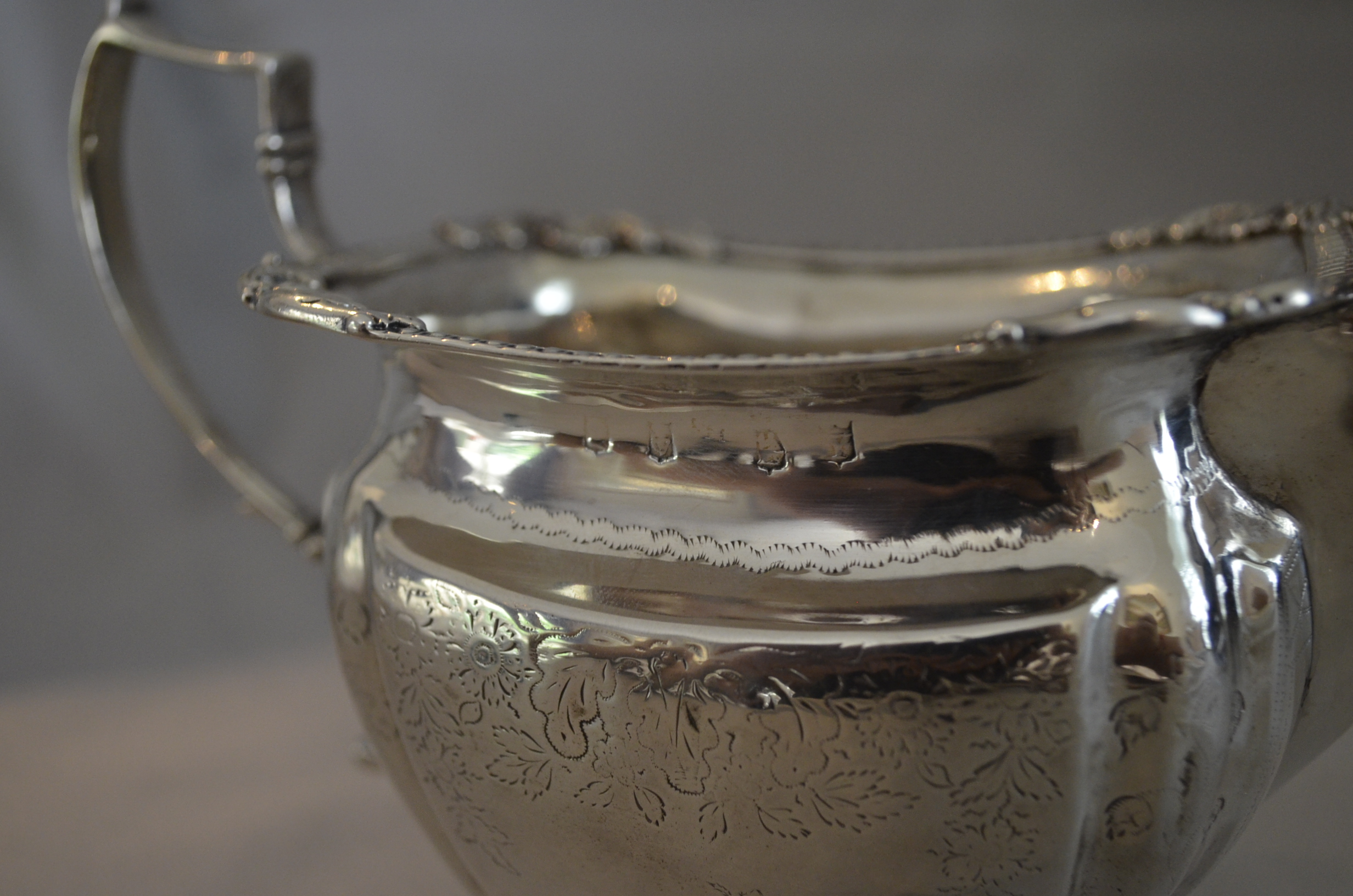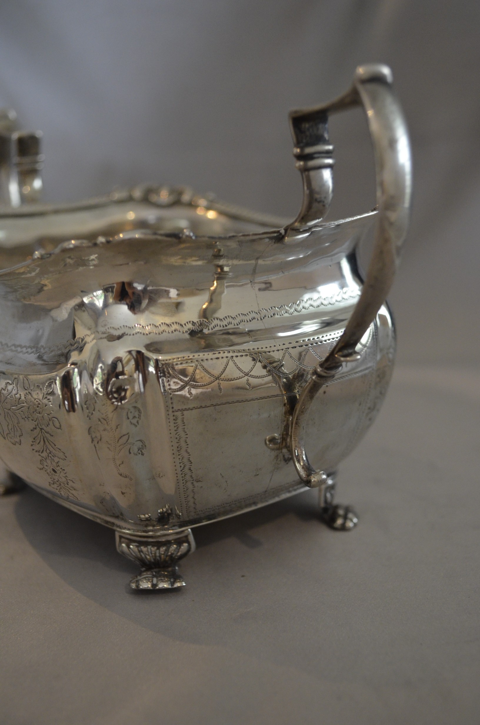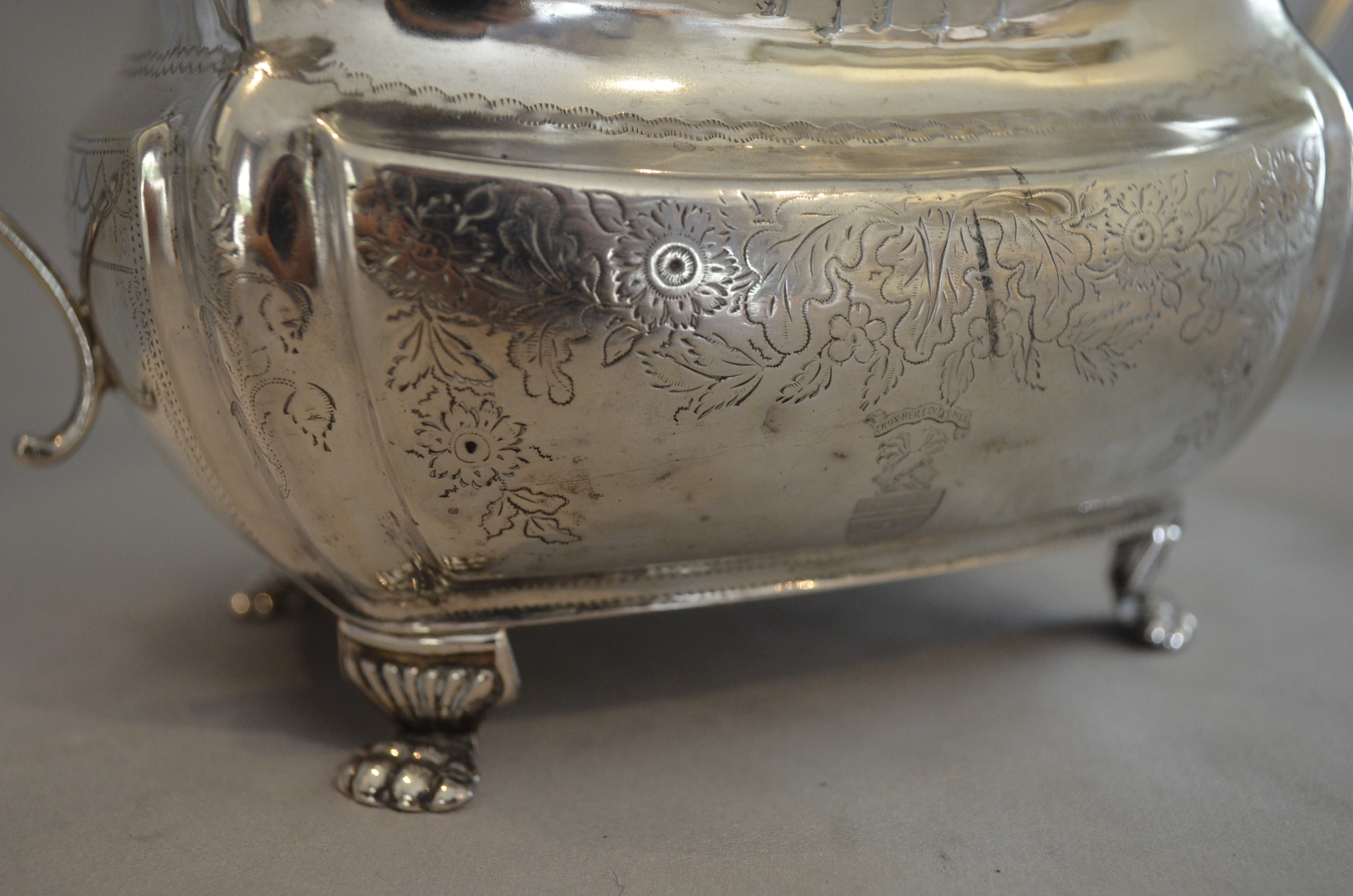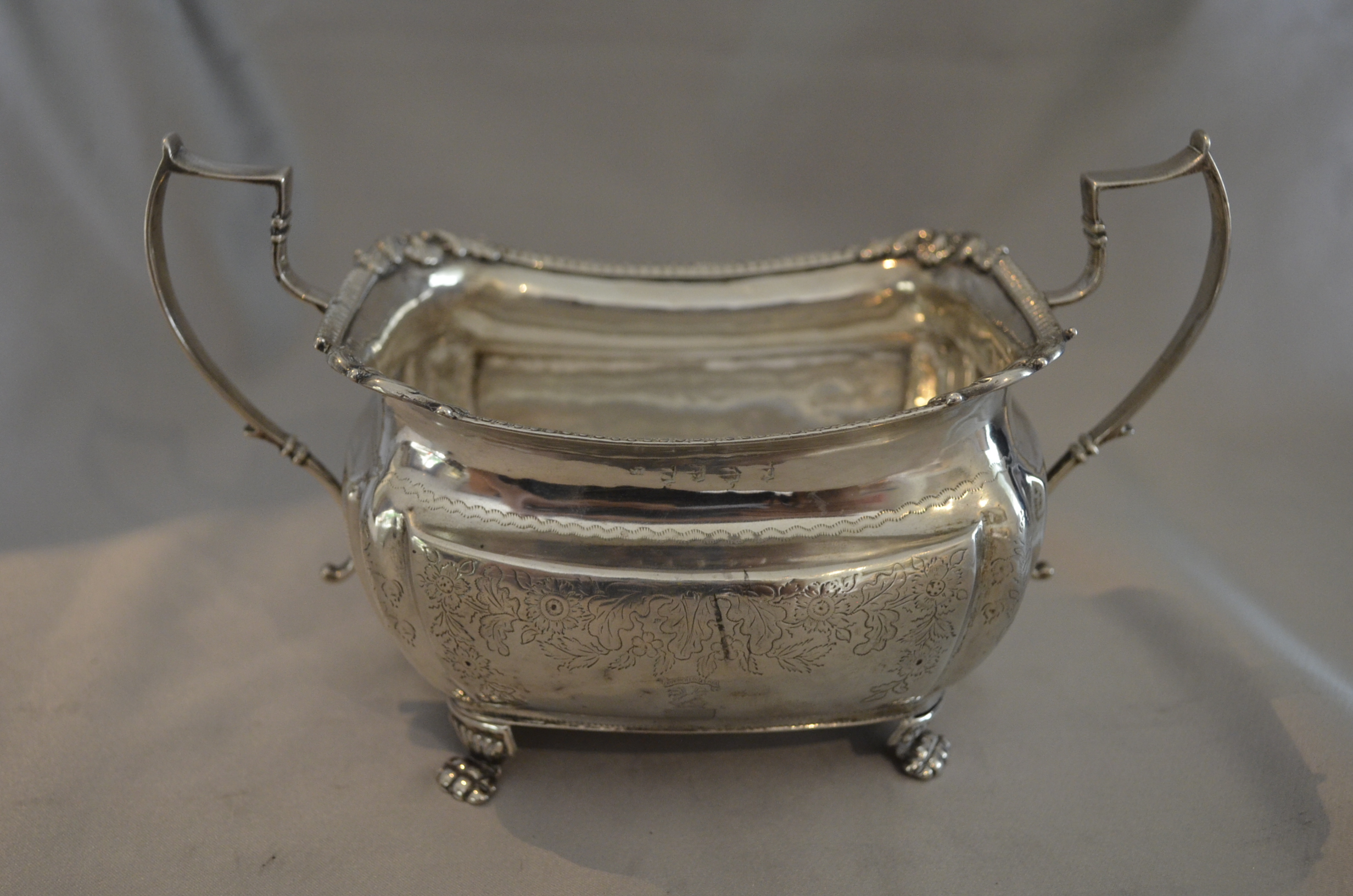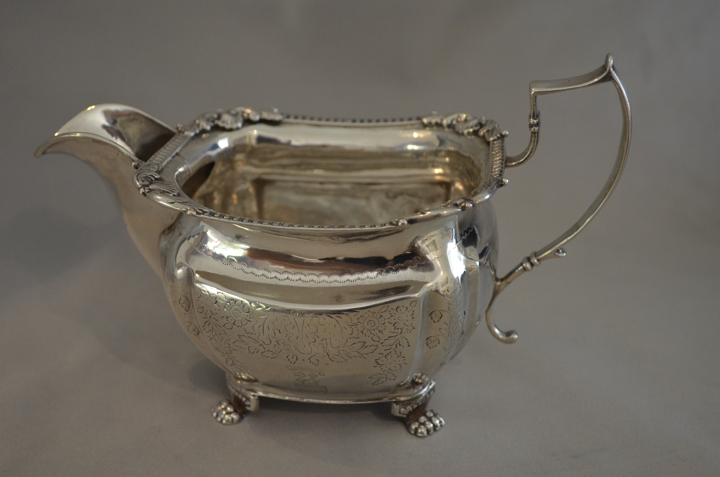 Irish silver . Two Georgian pieces, a milk jug and a sugar bowl. Although they are matching, each is are available separately. Interesting armorial engraving, the family has not been identified.