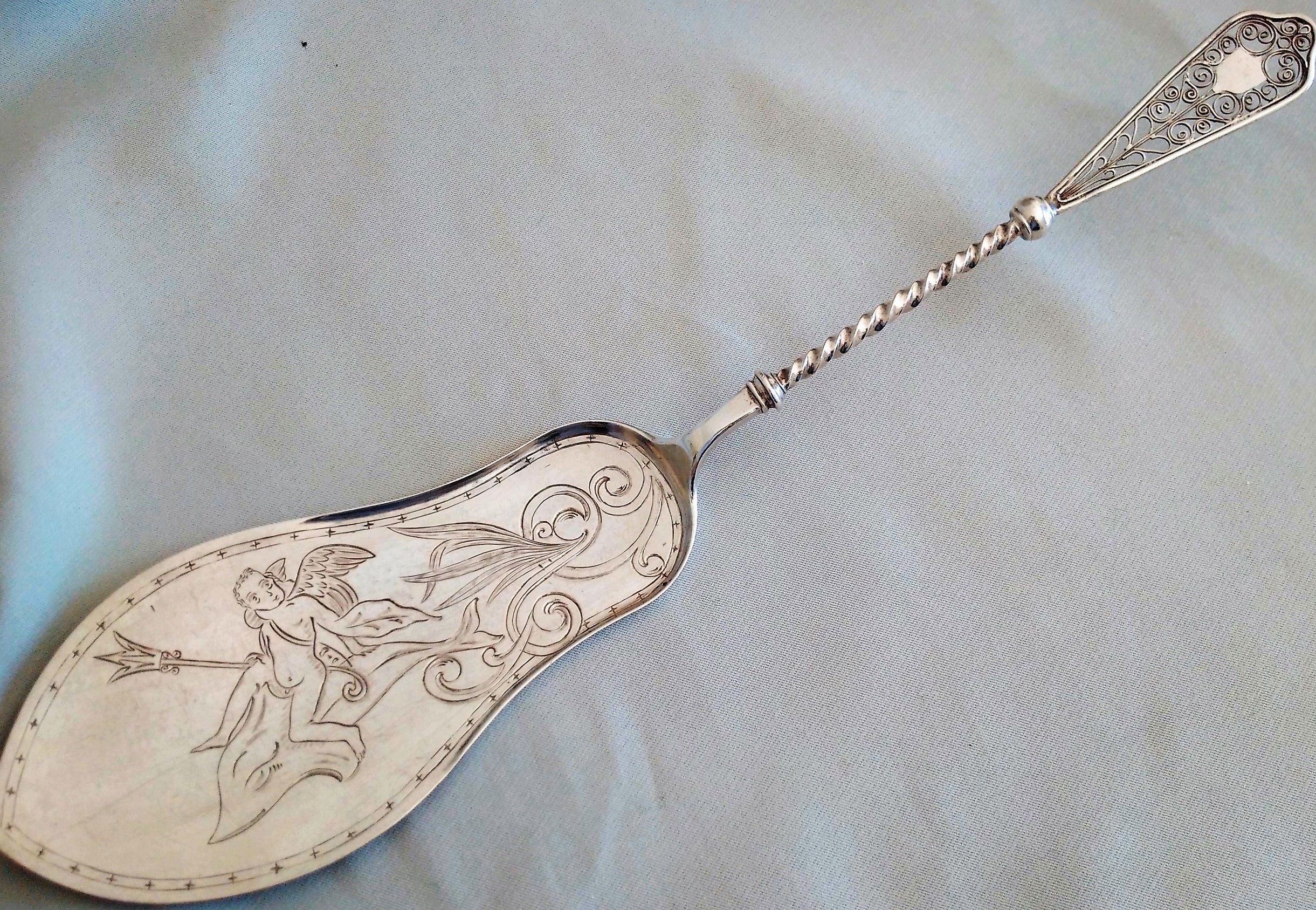 Antique Norwegian Silver Fish Slice dated 1879. (13.5 lodig fineness). Engraved with winged figure riding a fish holding a trident.